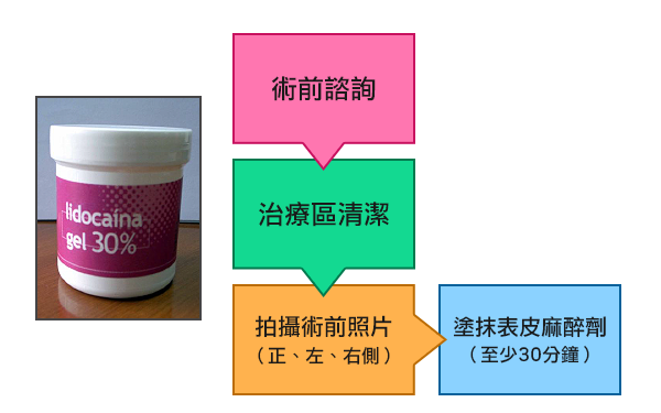 | 治療當天 | 紅、腫、熱、輕微刺痛 | 深層治療者,可塗抹抗生素藥膏抗發 炎,居家自行進行間歇性冰敷,使用 生長因子。依傷口處理原則清潔。 |