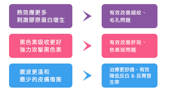 | 高速震波(250us + 10Hz)設計,打造全新755nm淨膚療程, 治療效果更勝傳統1064nm淨膚。 |