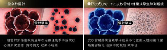 一般雷射就是微秒到奈秒,而PicoSure755皮秒雷射 550的picosecond(ps) ,雷射擊發時,所發射出的每一發雷射光能量,只停留在皮膚上極短暫的時間(最短550 x 10-12秒),在極短暫的時間把所有能量釋放完畢,會產生「機械光震波」,完整「震碎」黑色素成為粉塵狀態(更細小的顆粒),能讓黑色素快速代謝、大幅降低熱傷害、避免反黑、快速復原。