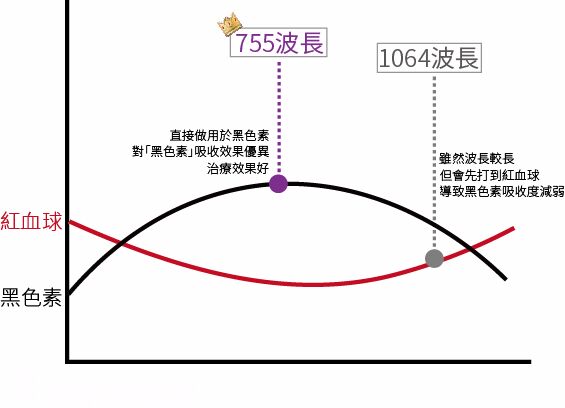 至於大家經常討論的755nm 與 1064nm兩種波長,755nm波長一直都是除斑除色素的優秀雷射來源,主要原因為亞歷山大755nm波長對於黑色素吸收效果的專一性,是目前雷射除斑當中最高的一個,因此單次治療效果明顯;