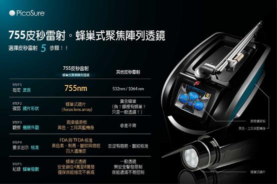 755皮秒雷射‧蜂巢式聚焦陣列透鏡 (俗稱蜂巢透鏡) ,通過美國FDA及台灣衛福部「黑色素」「凹疤」「皺紋」「刺青」4大適應症,在品質與安全上有了強而有力的保證;
