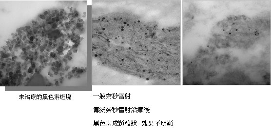 超過這個區段的波長(部分儀器標榜1540nm或 1550nm )在黑色素吸收光譜上效果是很差的,無法達到雷射除斑目的。